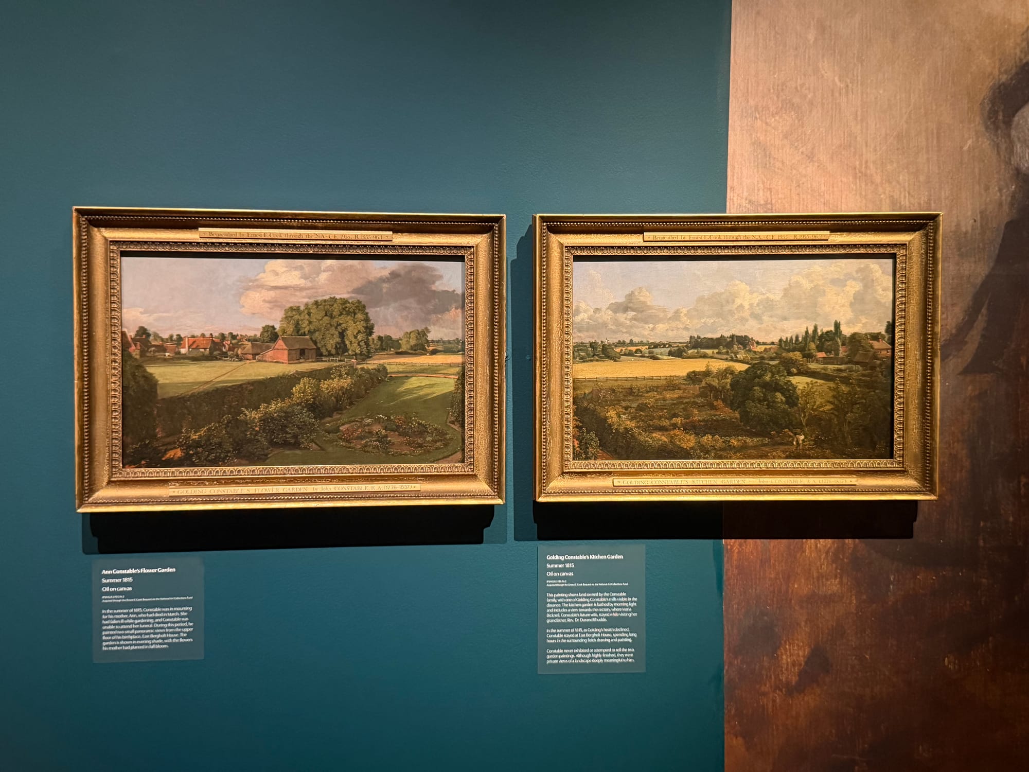 Two paintings hang side by side in the exhibition, both made in the summer of 1815 after his mother's death. They show views from the windows of the family home in East Bergholt: the flower garden his mother tended, golden fields stretching towards the horizon.